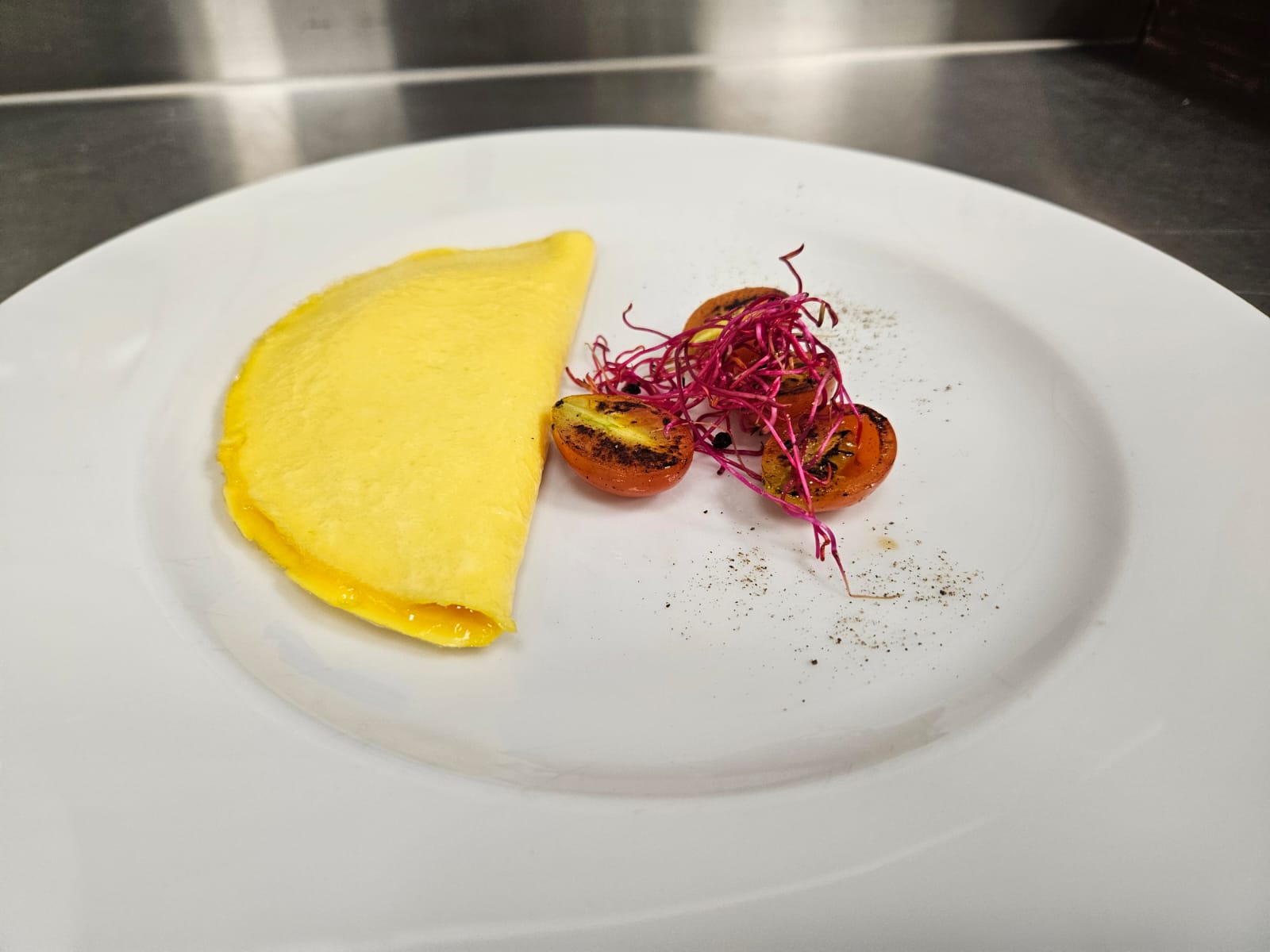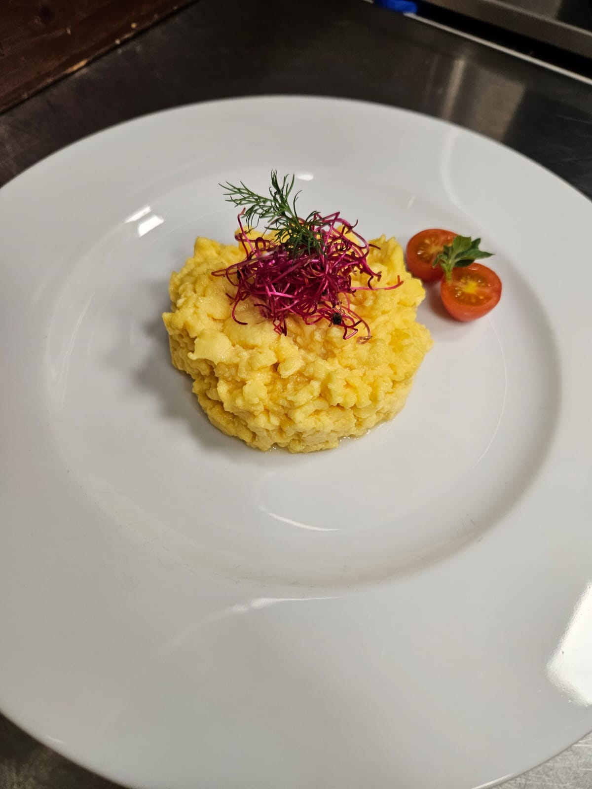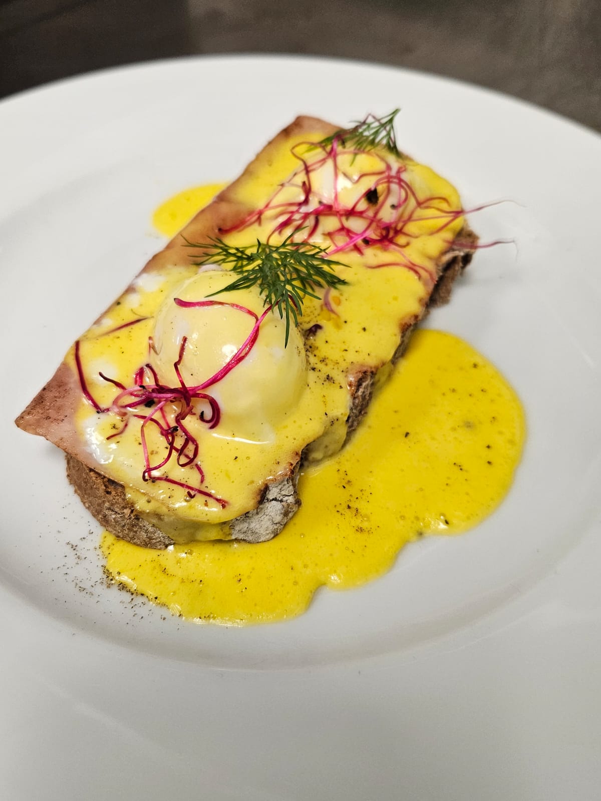 Café espresso, descafeinado, americano. Té clásico o en hebras. Jugo de naranja. Fiambres y quesos artesanales, huevos revueltos, salchichas, panceta, tomates cherry, yogurt, mix de cereales, selección de tostadas, mermeladas, viennoiserie, patisserie, frutas de estación.